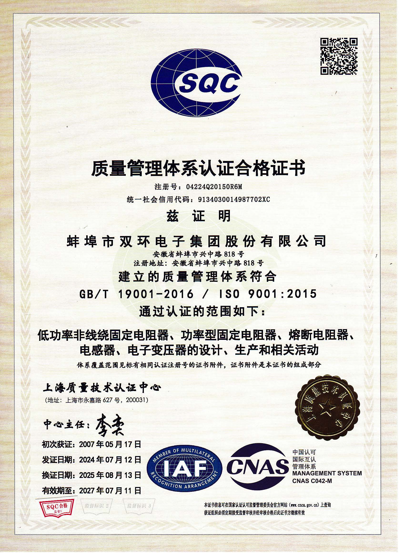 质量管理体系认证合格证书